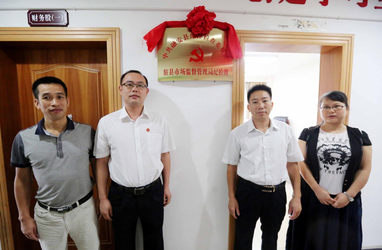 6月28日,在融安县市场监督管理局,县纪委书记欧俊锋(左一)为驻县市场监督管理局纪检组揭牌。(谭凯兴 摄)