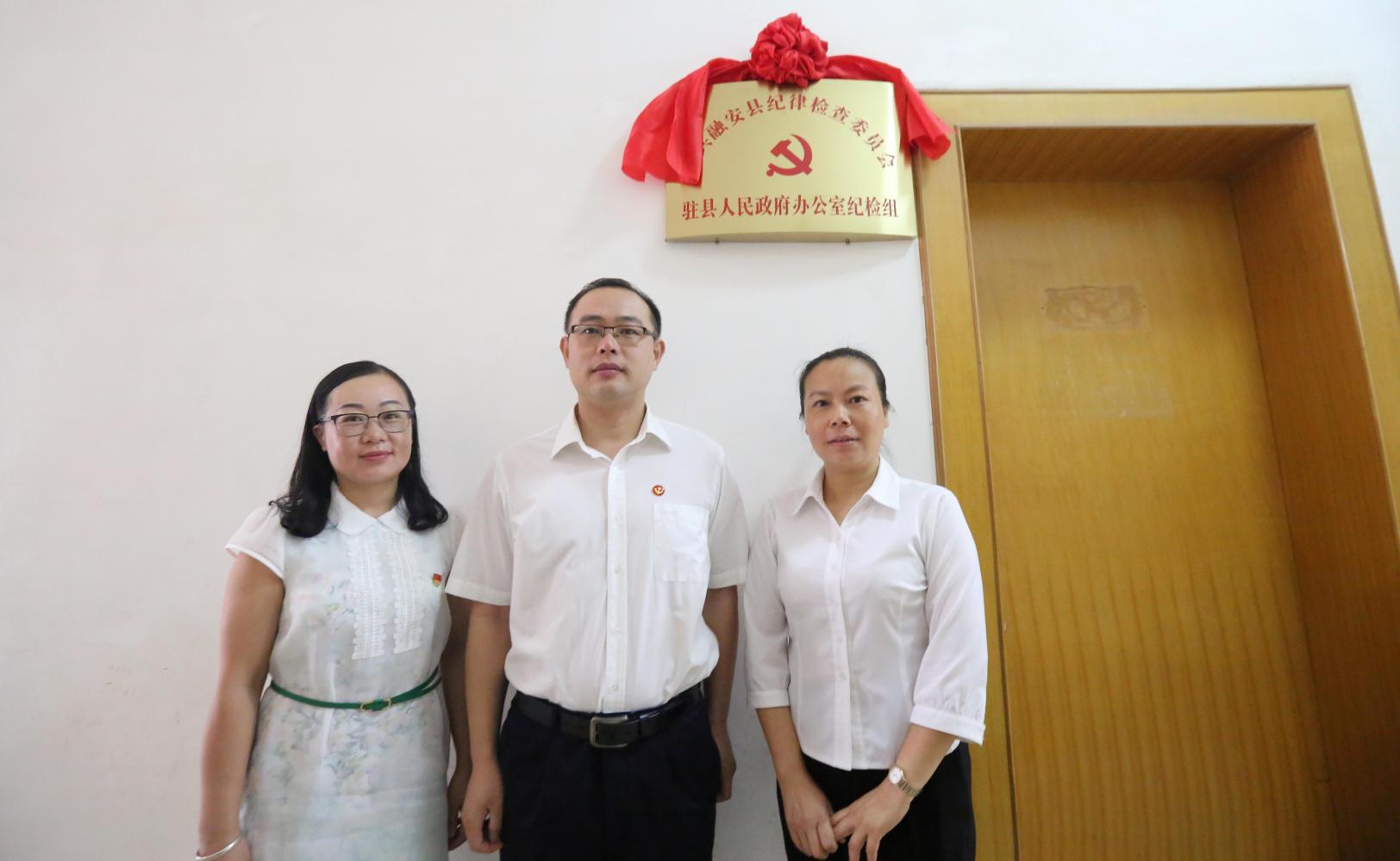 6月28日,在融安县政府人民政府办公室,县纪委书记欧俊锋(中)县政府办主任覃谊(右一)共同见证揭牌。(谭凯兴 摄)