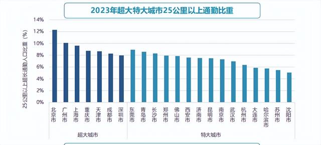 《报告》显示,在22个超大特大城市中,近800万人承受25公里以上超长通勤,超大城市平均比重为9%、特大城市为7%。