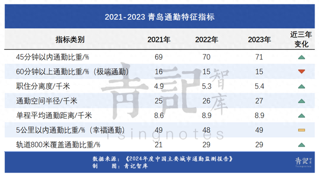 其中,青岛45分钟以内通勤比重连续两年上升,从2021年的69%上升至2023年71%。