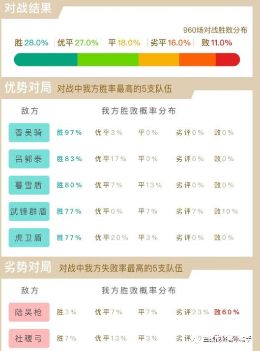 对战结果——28%胜率,27%优平,18%五五开,16%劣平和11%战败,其中对战吴骑周泰菜刀的和各种盾兵都拥有较大的优势,缺点自然不用多说就是怕火!