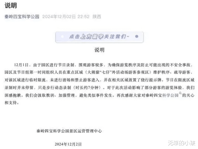 网络上流传的关于园方给予节目组特殊待遇,要求游客长时间等待拍摄的言论,也引起了广泛关注。对此,秦岭四宝科学公园方面迅速作出回应,澄清表示,园方仅是为了确保游览秩序与安全,对特定区域进行了临时限流,并设置了清晰的绕行提示牌。录制期间,节目组并未在园内停留过久,对于此次事件给游客带来的不佳体验,园方同样表达了深深的歉意,承诺将不断优化服务,提升游客满意度。 #快乐再出发录制同游客起冲突#