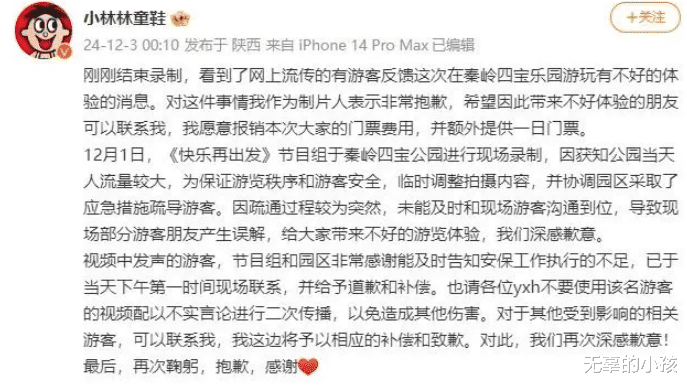 12月3日凌晨,在一片静谧的夜色中,《快乐再出发》的制片人满怀诚挚与歉意,针对节目在陕西西安秦岭四宝科学公园的录制活动,向未能如愿见到憨态可掬的大熊猫“七仔”的游客们,发出了深情的致歉之声。这份歉意,如同冬日里的一缕温柔阳光,试图穿透寒风,温暖每一位游客的心房。制片人不仅郑重承诺,将全额报销受影响游客的门票费用,更慷慨地提供了一日门票作为额外补偿,以期弥补这一意外带来的遗憾。