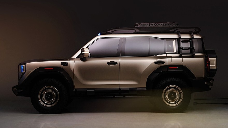 该车整体采用 “方盒子” 造型,这种经典的硬派越野车身轮廓现在很流行。侧面线条简洁有力,笔直的腰线从引擎盖一直延伸至尾灯处,上方是黑化的 B/C/D 柱、悬浮式车顶和铝合金行李架。还有宽体黑色轮眉向外扩展 80mm,搭配20 英寸五辐铝合金轮毂以及 AT 胎,营造出高大的车身视觉效果。