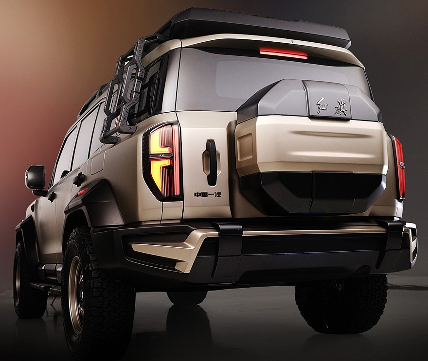 车尾采用侧开式尾门,外挂式备胎罩印有 “红旗” 标识,下方黑色包围集成双拖车钩和后雾灯。尾灯采用竖向布局,底部护板与前保险杠相呼应,突出较大。