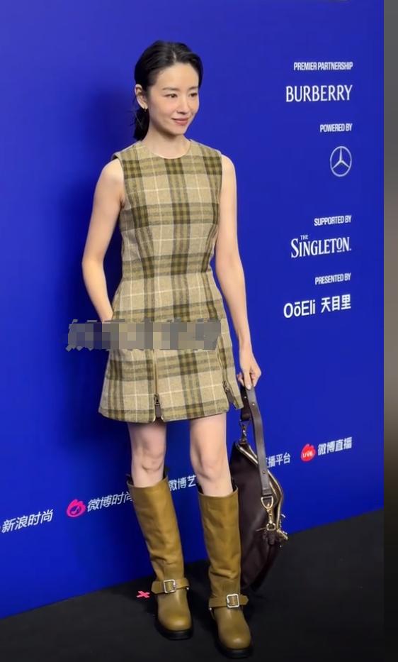 董洁将长发简单的梳在脑后,身上穿了一件绿色格子的无袖连衣裙,脚上则是穿了一双同色系的丝靴子,这混搭的风格算是让董洁学会了。