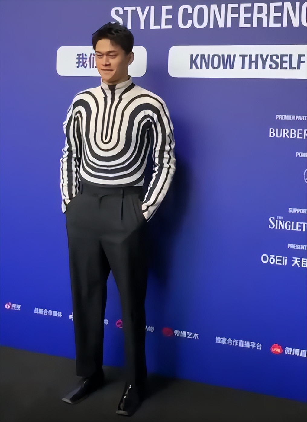 在红毯上最先登场的游泳冠军孙杨身穿一件黑白条纹相间的高领毛衣,下半身搭配直筒西装裤,脚上则是穿了双平底不能再平的皮鞋。