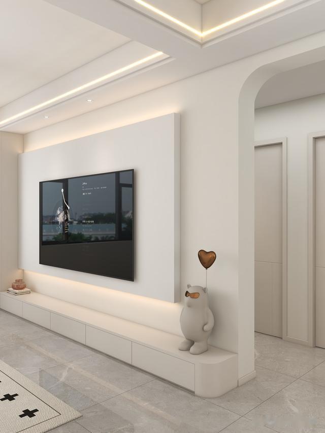 没有做现在很流行的无主灯布置,中间还需要做平顶去安装灯具,个人感觉有一些压层高,就选择这种简约的吊顶,还有一些山丘射灯的搭配,很有精致感。