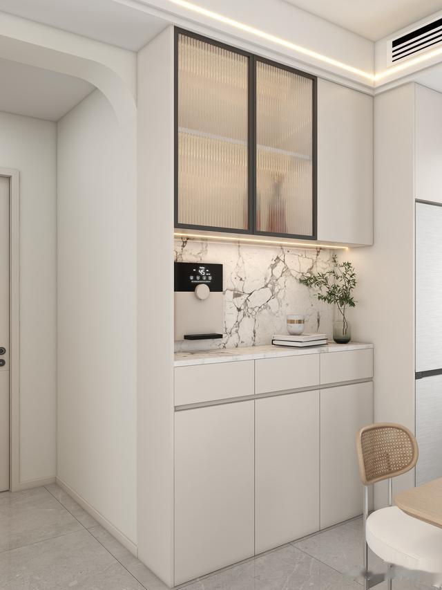 餐边柜的墙面不是很宽敞,在左侧做了分段式的造型,下方的柜体还布置了抽屉的功能,以及无拉手的工艺。