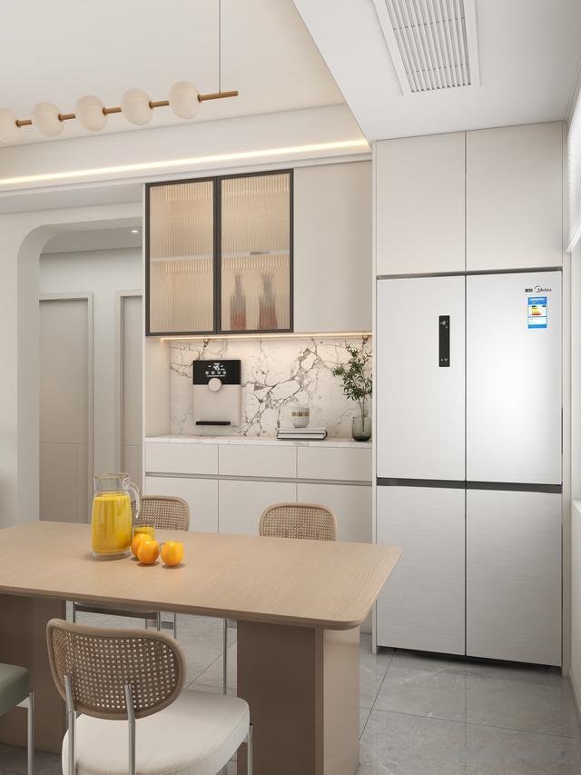 为了让厨房的台面能够做了更长一些,就将冰箱放置在了餐厅的空间,与餐边柜一体布置,选了内嵌式的冰箱,上方还能够多做一组储物柜。