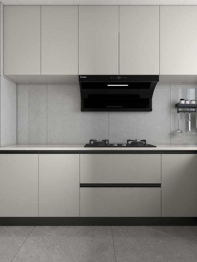 地柜的门板与吊柜的一样的,没有做造型,都是素色的平板门,显得有整体感又很协调,地柜的灶台下方还布置了一组拉篮,台面是白色的石英石,没有太多的颜色,反而看上去简约精致又有品位。