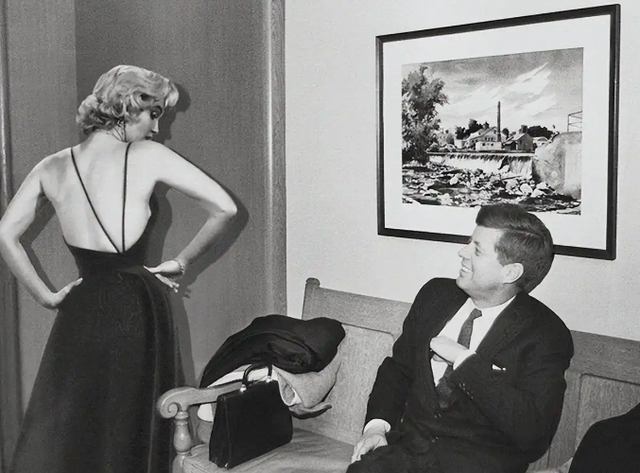 玛丽莲·梦露身着一袭华丽的礼服,眼神中透露着一种独特的性感与智慧,而肯尼迪,作为一个刚刚走向政治舞台的年轻人,散发着自信的魅力。