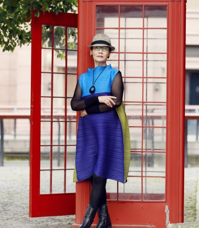而对于中年女性来说,太鲜亮的颜色会有点扮嫩的嫌疑。所以潘虹的这条蓝色连衣裙,是一个拼接的款式,由不同程度深浅的蓝色拼接而成,领口的浅蓝色突出了年轻的活力,下半身的颜色以深蓝色为主,除了显瘦,还非常沉稳,给人浓浓的底蕴。搭配上优雅的黑色项链,温柔又睿智。