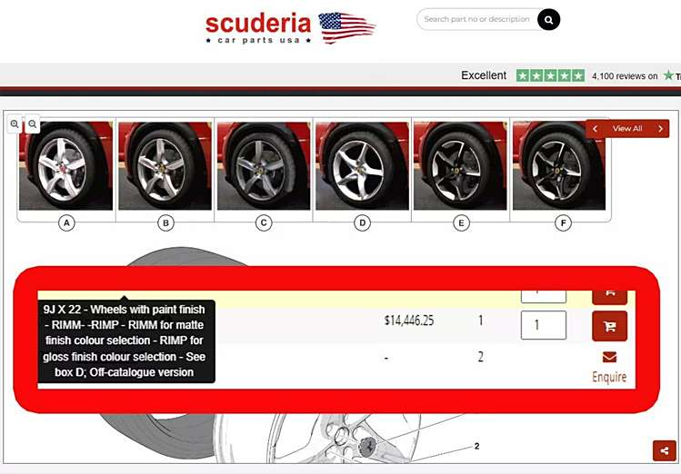 根据Scuderiaparts的零件目录显示,这款车的一套前轮22寸、后轮23寸的锻造轮圈,包括马萨诸塞州的税费和运费在内,价格高达57,200美元。而Millermotorcars仅列出了英国的一个价格,即包括增值税在内的每个轮圈为13,327英镑(约16,300美元),四个轮圈的总成本将达到53,308英镑(约65,000美元)。