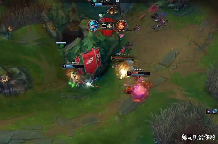 第二局比赛RNG的状态明显要比第一局好很多,没有给到tarzan太多的机会。这个时候LNG犯下了冒进的错误,在推掉RNG下路一塔之后还想要进行推进,被小明抓住机会直接开团,不得不后撤的LNG被TP下来的武器大师直接包了饺子。中下野阵亡之后比赛局势就此逆转,阿bin的武器大师在关键的下路团战当中拿下三杀,带领队伍扳回一城。