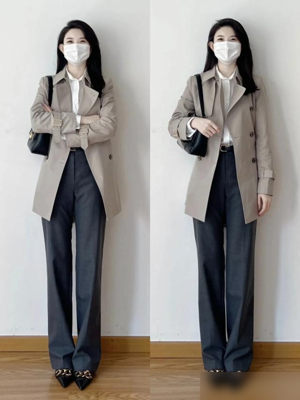 高腰直筒西装裤本身就是腿精神器,配上短风衣直接把“上短下长”公式焊死:内搭薄针织或衬衫,米棕灰主色调里点缀点粉色花纹,知性又带点甜,会议室和咖啡厅无缝切换。