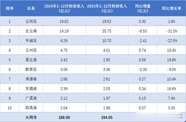 浑源县、天镇县、广灵县和阳高县财政收入相对较低,2024年全年累计金额均在2-3亿元,分别为2.88亿元、2.39亿元、2.12亿元和2.04亿元,排在了全市最后四位。从表现来看,四县同比均实现了正增长,表现较好。其中浑源县和天镇县增速更是都在10%之上,分别达到10.4%和16.6%,居全市前列,期待接下来能否继续保持,争取实现更大突破!