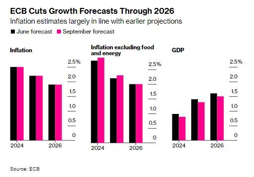 这一疲软促使欧洲央行下调了对2024年、2025年和2026年的国内生产总值(GDP)预测,目前预计今年将增长0.8%,而上一轮季度预测为0.9%。通胀前景基本保持不变。