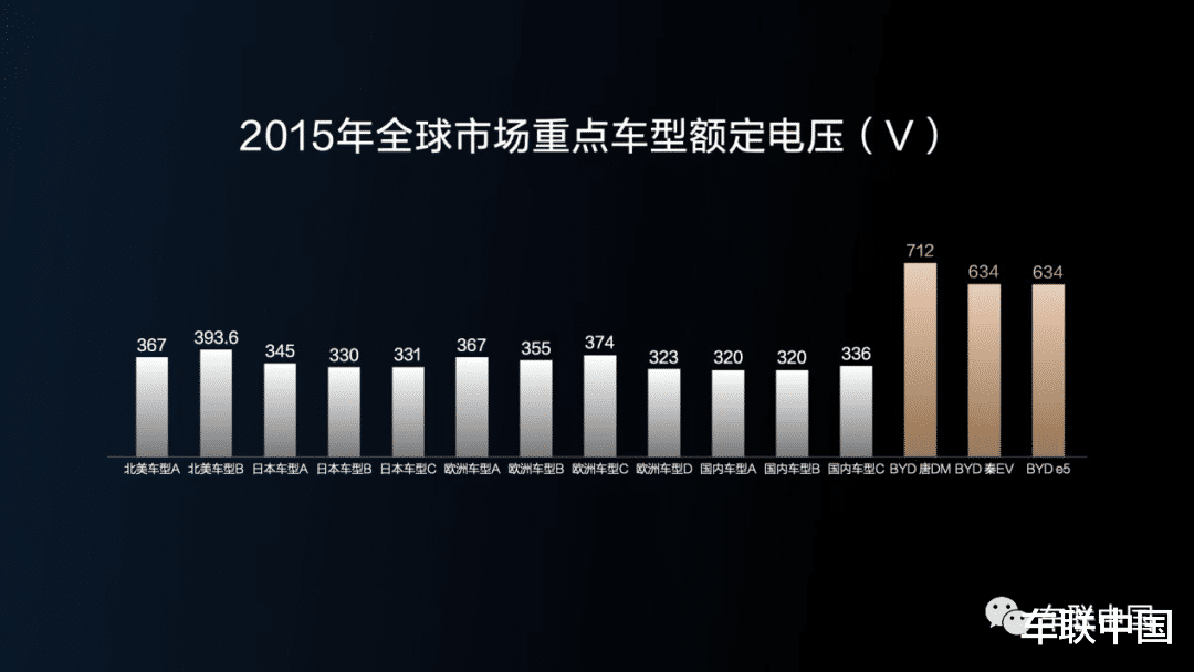 比亚迪在2015年全球首创乘用车800V高电压平台,搭载在秦EV(2015款)、唐DM(2015款)等车型上。
