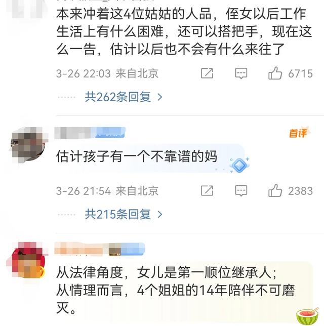 也有的网友说:“这个女儿是个白眼狼吧,本来就这四个姑姑的人品 ,以后说不定生活上或者社会上有什么困难还能给你搭把手,这下起诉了看来以后不会来往了 ”
