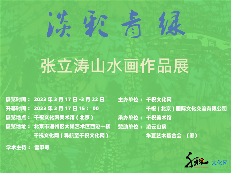 千祝文化网讯,淡彩青绿——张立涛山水画作品展,于2023年3月17日在北京圆满开幕。张立涛淡彩青绿山水画的用色有着更为自由化和个性化的艺术表现,不仅给大家带来清心宁静的感受,更以可亲的视觉美感同观者零距离与自然亲切对话,伴随着笔端那一番番绿意,悄悄地进入这充满墨香的山水意境,感受和体悟那份超尘的气息,令人留恋,令人沉醉。兴许,这就是张立涛淡彩青绿山水画的真切之处、动心动容之处。张立涛先生对于美的描绘是淋漓尽致的,体现了中国人的艺术情操!因此,张立涛先生可以非常自信的对外宣称“平生得力之处引以为傲的是在于演化出书法线为主的山石结构与平面化构成画法,能以书法之法作画。”