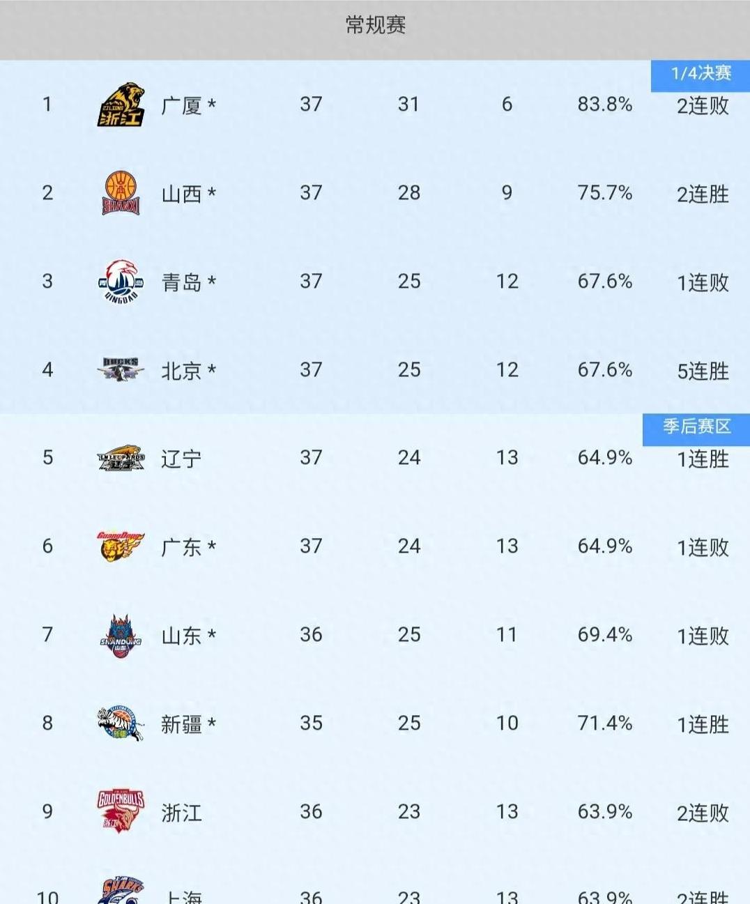 山西在险胜广东后,继续保持第二的位置;辽宁凭借狂胜青岛,排名上升到第五;而青岛则跌至第三。