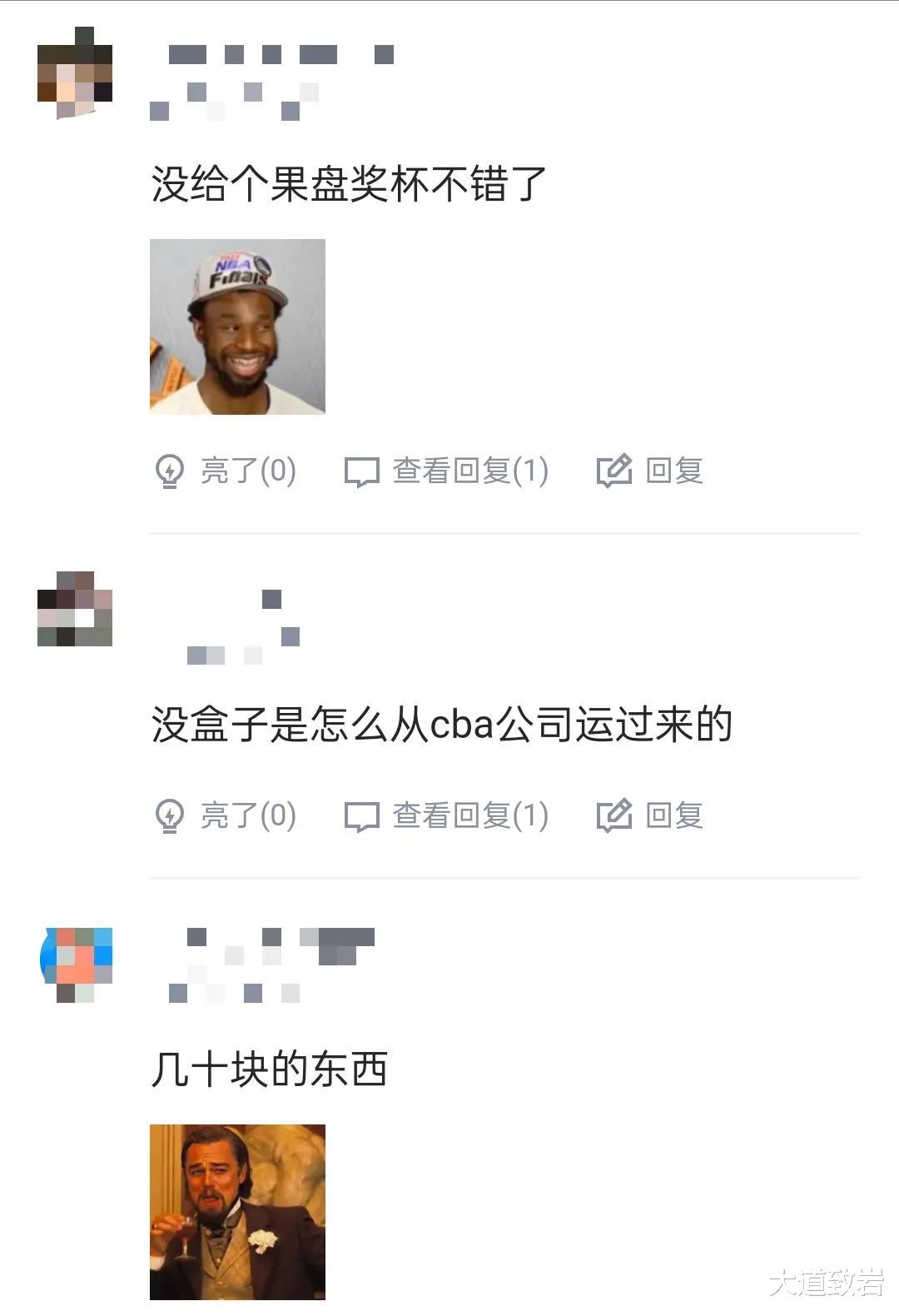 对于CBA各种乌龙事件,很多球迷早已见怪不怪,不少网友在评论区的回复更是令人忍俊不禁,有人质疑奖杯成本估计“几十元钱”,还有人旧事重提,想起了丁彦雨航在2017-2018赛季最有价值球员奖杯竟和电商平台的果盘是同款。