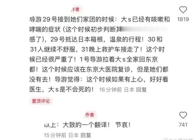 这位知情人士称,她们抵达东京后应该首先去东京大医院复诊,但是她们都没有去!地接导游认为:这个时候如果有上心,好好看医生,大s是不会死的。