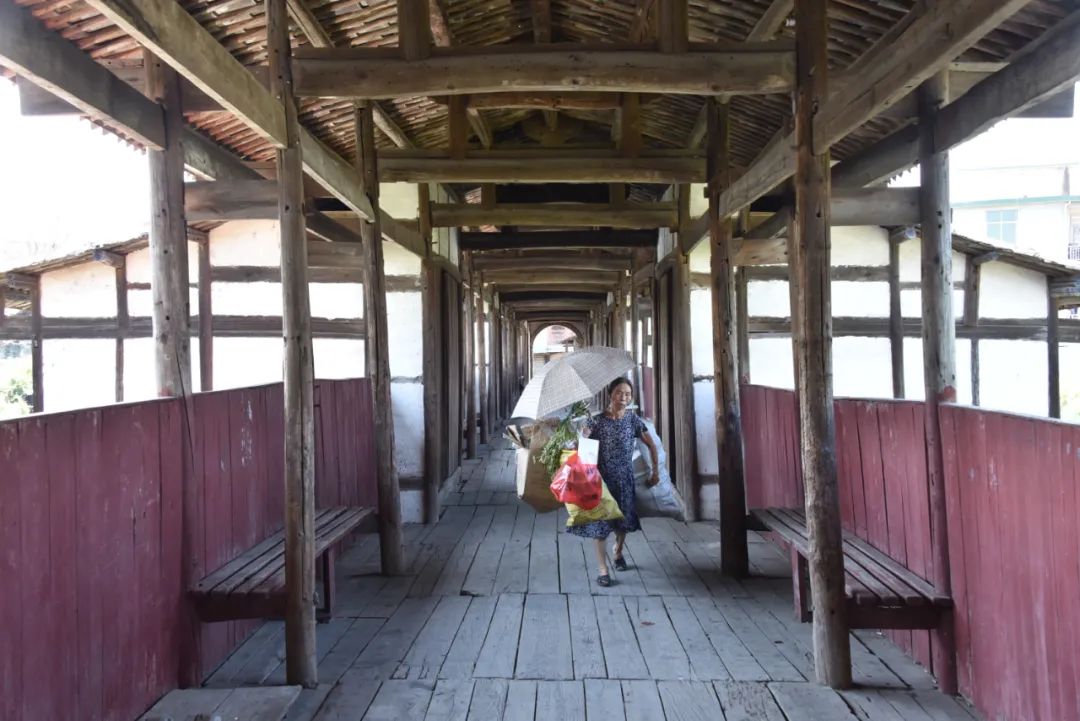 桥面上竖柱架梁,顶部为木抬梁结构,复以瓦盖,桥内通道宽约4米,桥面为木板铺就,两侧做有板壁,设有供休息用的条椅,它不仅能交通渡河,还能遮风避雨、纳凉休憩、交流买卖。