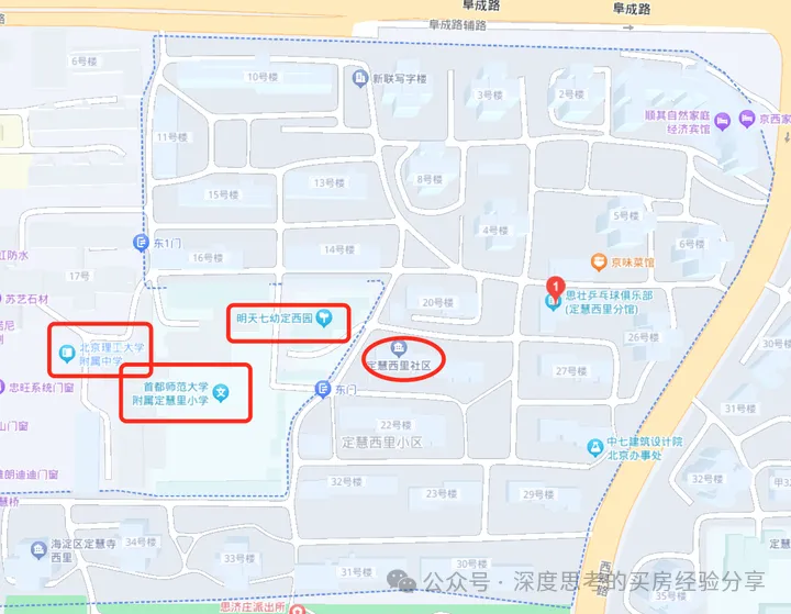 4、小区踩盘介绍1、定慧西里(定慧里小学)定慧西里位于西翠路的西侧,小区1989-2021年建成,28栋楼,有板楼也有塔楼,2940户,集中供暖,天鸿房地产开发,房修一物业,物业费1.82元/月/平。定慧西里19号楼是一个幼儿园-明天七幼,18号楼是首都师范大学附属定慧里小学,17号楼是理工附中南校区,也就是原来的六一中学。均价7.9W/平。