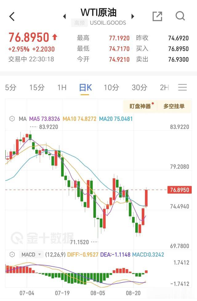 8月26日,原油价格出现大涨。WTI原油日内大涨3%,现报76.94美元/桶;布伦特原油现涨2.6%,报80.27美元/桶。