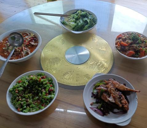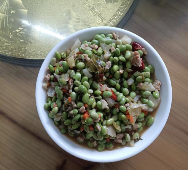 他们六点下班,七点开始吃晚餐,虽然最近天阴阴的,但是因为现炒现吃,所以热乎乎的吃着暖胃暖心。今天来了四十个员工,刚好一桌八人可以坐五桌,第一道菜是这个黄豆肉沫,这个黄豆还没变黄,是最嫩的时候,和肉沫一起翻炒,里面加了干辣椒提味,还加了一些咸菜,这样味道就很适中,咸淡均衡,非常下饭。