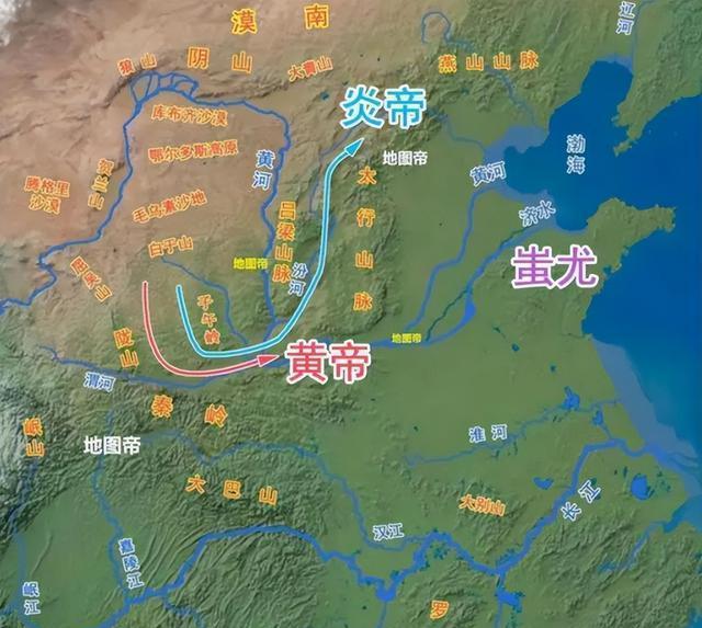 蚩尤和炎帝在河北北边干了几架,炎帝因为打不过蚩尤部落那些厉害的金属武器,老是输,最后没办法,只能跑到南边去找黄帝部落帮忙。