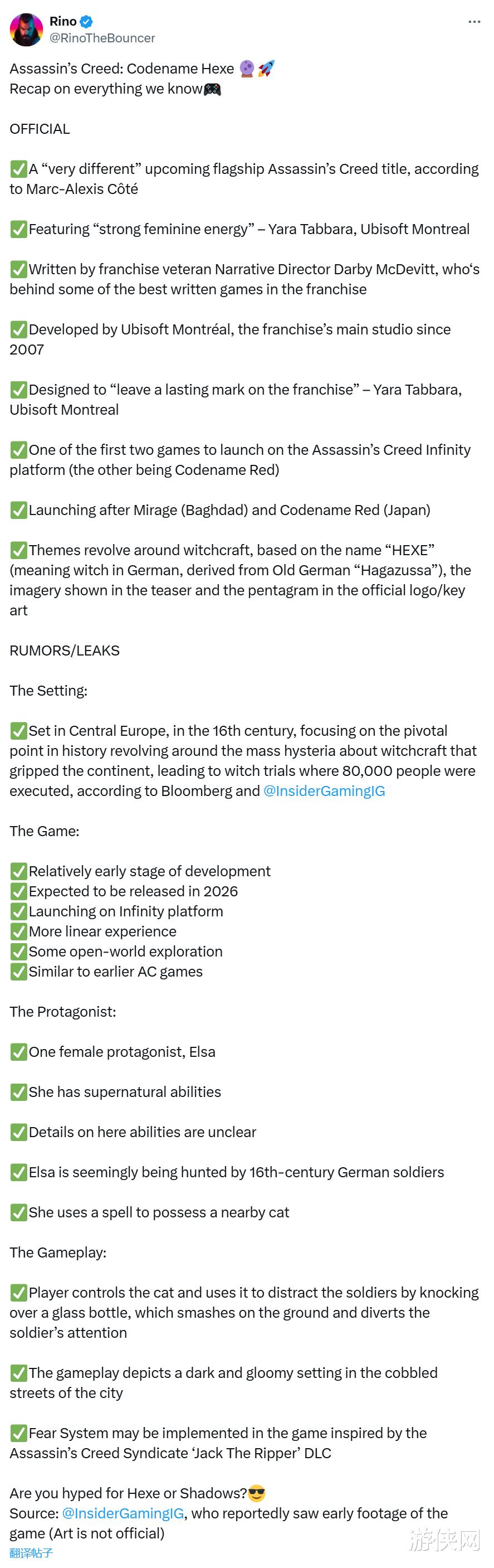《刺客信条代号Hexe》是育碧公布的《刺客信条》系列新作,预计于2026年发售,目前仍处于早期开发阶段。近日,游戏博主Rino对官方消息和网上爆料进行了汇总。