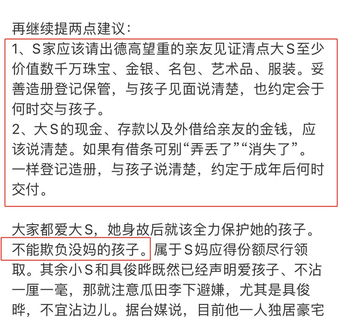 陈岚的提议:保护大S留给孩子的财产,是亲人的责任大S突然离世,留下两个孩子和一大笔财产,按理说,亲人之间本该齐心协力,给孩子尽量安稳的未来。