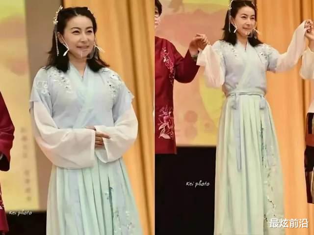 郭晶晶这套交领半壁汉服裙属于改良汉服,虽然材质面料并不如范冰冰那套华贵,但却给人一种清新脱俗之感。这条裙子的设计简约大方又很雅致,青色的布料上绣着淡雅的花朵,宛如春日里奔跑在花海中的明媚少女。