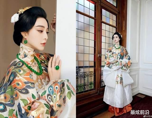 范冰冰极爱翡翠,帝王绿翡翠耳环项链以及鸽子蛋集别的翡翠戒指,搭配这套孔雀图案的明制长袄再合适不过,重现东方古典主义奢华之美。