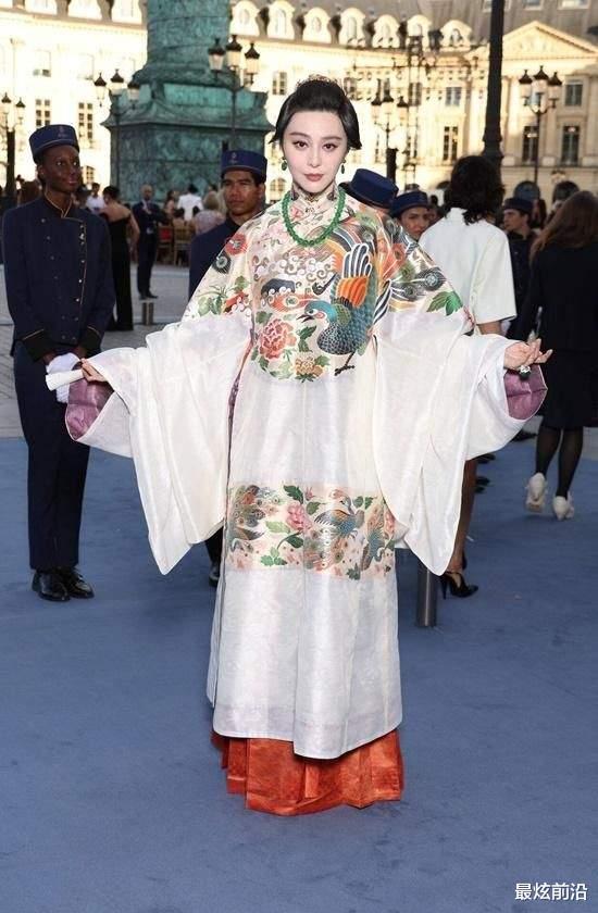 范冰冰这套明制立领斜襟长袄来自国内知名高端汉服定制品牌明华堂。上面绣着精美的孔雀花蝶图案,立领处采用金饰珠宝纽扣,宽大的袍服尽显雍容大气,复刻了明朝的传统命妇礼服,非常符合范冰冰端庄华丽的气质。