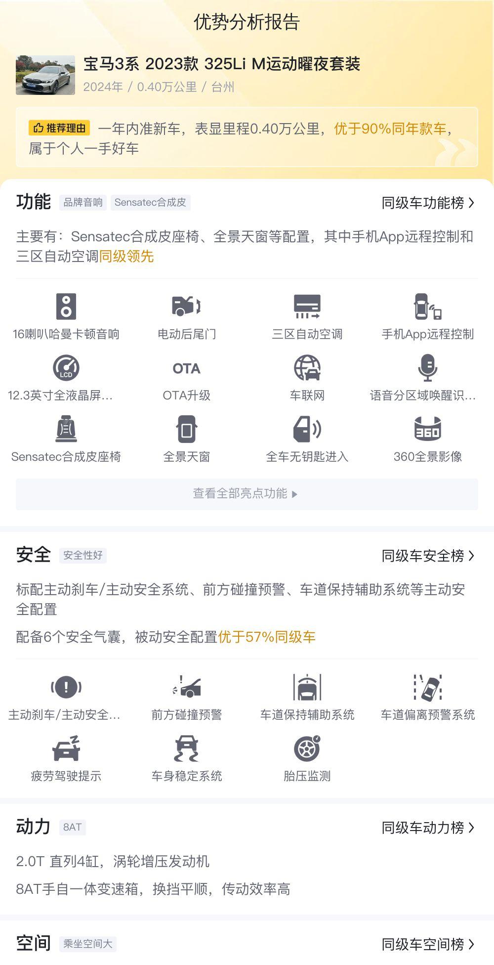 除了车况之外,用车成本也是需要考虑的重要因素。根据懂车帝的数据,宝马3系2023款325Li M运动曜夜套装的10年平均用车成本为13405元/年,这其中包括了油费、保养费、保险费等各项支出。这个数字在同级别车型中属于较高水平,主要是因为宝马的保养费用相对较高。因此,在购买之前,需要对自己的经济状况进行评估,确保能够承担这笔额外的开支。