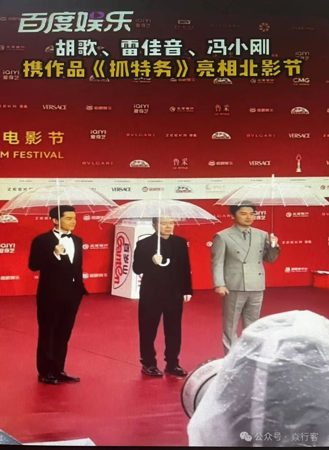 胡歌着黑色西装搭配领结,尽显优雅;冯小刚身穿黑色正装,沉稳大气;雷佳音则身着浅灰色西装套装,简约中透着干练。三人雨中撑伞亮相,为作品《抓特务》宣传造势。