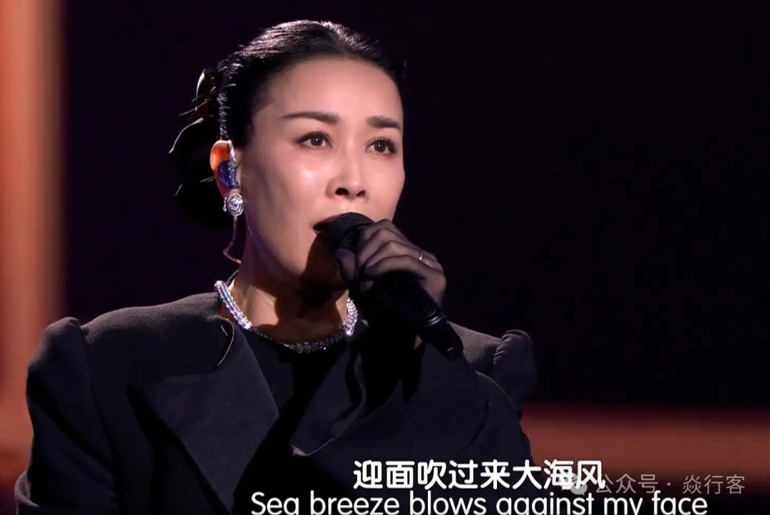 那英黑色西装外套增添利落感,喇叭袖设计飘逸。内搭简约,与外套搭配和谐。黑色蕾丝鱼尾裙采用透视材质,精致花纹与亮片装饰,华丽且具设计感。