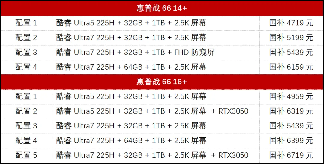 战66 16+首发5款子型号,同样搭载酷睿Ultra5 225H或Ultra7 225H处理器,屏幕均为100% DCI-P3广色域+120Hz刷新率+400nit亮度的2.5K面板,可选32GB或64GB内存,还有RTX3050的独显版,国补后价格覆盖4959元到6719元。