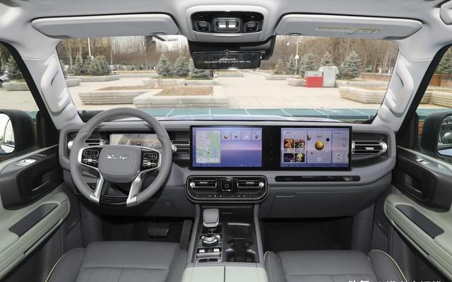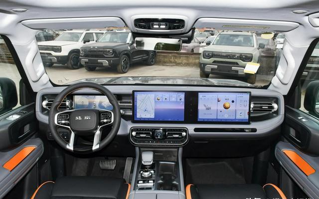 北京越野BJ40增程版在内部装饰上提供了两种颜色选择:绿野仙踪和破晓霞光。车辆装备了10.25英寸的数字仪表盘以及两块12.8英寸的显示屏,分别位于中控台和副驾驶前方,并装有启动按钮屏幕。该车型采用了高通骁龙8155芯片作为车载系统的核心。此外,BJ40增程版的四个车门均采用了无框设计。