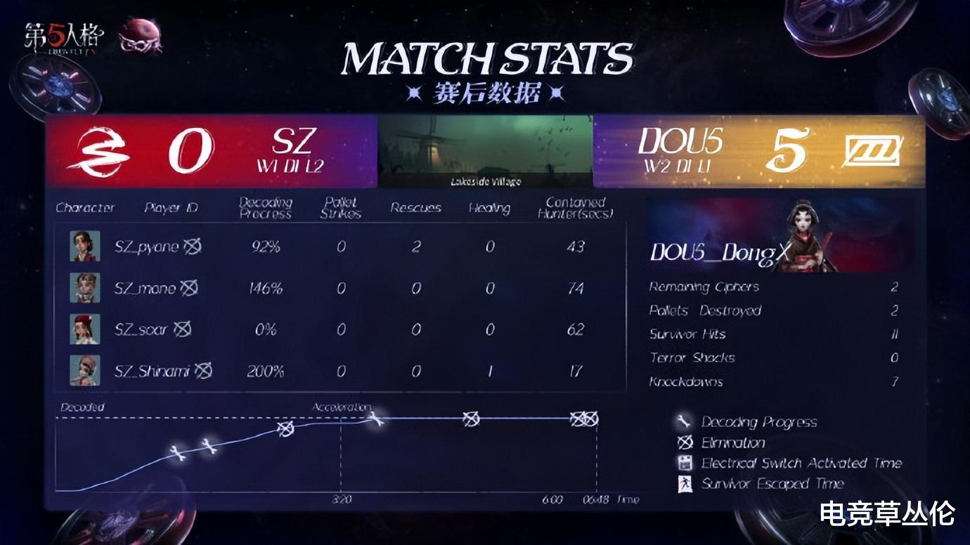 DOU5同SZ打到加赛,最终DOU5以3:5;4:4;5:3;7:2的比分击败强敌SZ。首局比赛,上半轮Shinami祭司牵制监管者111秒,古董商在中期时利用机关萧干扰监管者节奏,最终SZ完成三出;下半轮MiraiK渔女开局追击舞女,佣兵多次稳定救援,为队友争取了破译时间,随着空军在开门战中被留,双方战平。本局比分为SZ5:3DOU5。