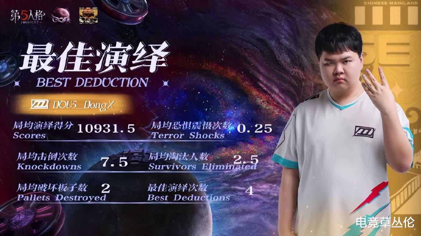 DOU5击败SZ之后,以C组头名身份晋级!可以看的出来,DOU5是一支韧性极强的战队,尤其是监管者选手DongX,第一局一抓、第二局二抓、第三局三抓、第四局四抓,如果有第五局,那岂不是连机械师的娃娃都跑不了~本场比赛的最佳演绎也是毋庸置疑的给到了DongX!