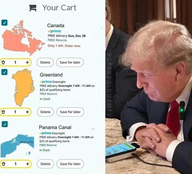 在西方过节的这几天,美国释放出了极其不寻常的信号,特朗普先是在自己的社交媒体上放出一张图,显示的是他儿子的购物车,购物车中赫然是格陵兰岛、加拿大和巴拿马!而CNN也第一时间发布了消息,称特朗普团队寻求美国的扩张——领土扩张。特朗普还曾在社媒发布消息,指着巴拿马运河称“欢迎来到美国运河”,还和特鲁多开玩笑,称加拿大是美国的第51个州;对于格陵兰岛,特朗普甚至想直接买了。
