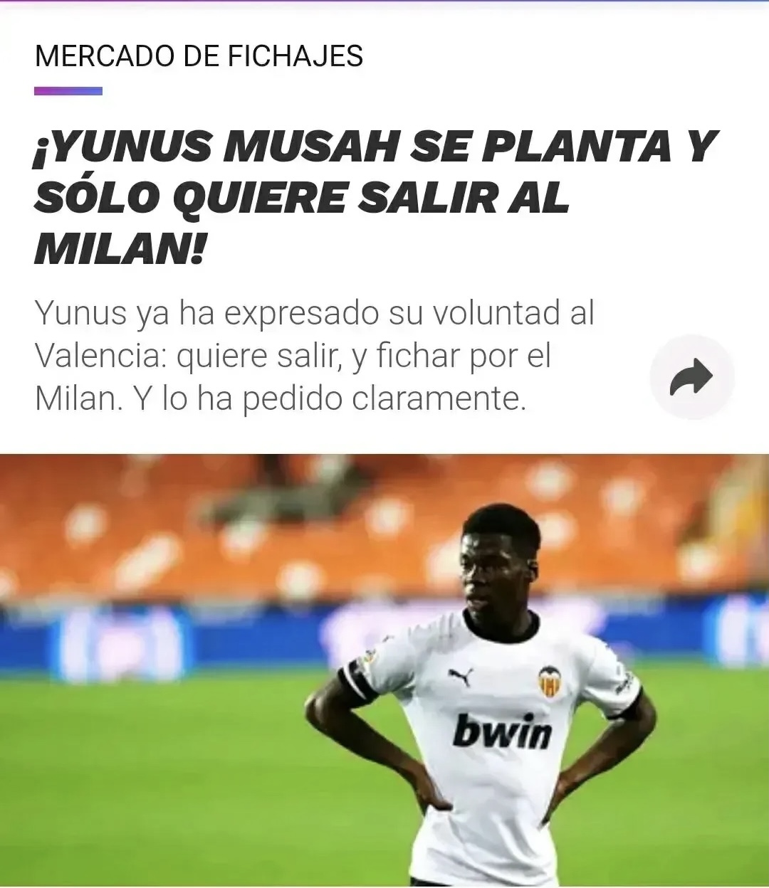 穆萨已经向瓦伦西亚表达了他的意愿:他想离队,加盟米兰。他表达的得很清楚,双方的合作已经结束。米兰和瓦伦西亚之间的谈判已经进行了几周,将近一个月;但在持续的博弈之间,谈判并没有解锁,穆萨表达了不满,并且语气中有威胁俱乐部的词语。