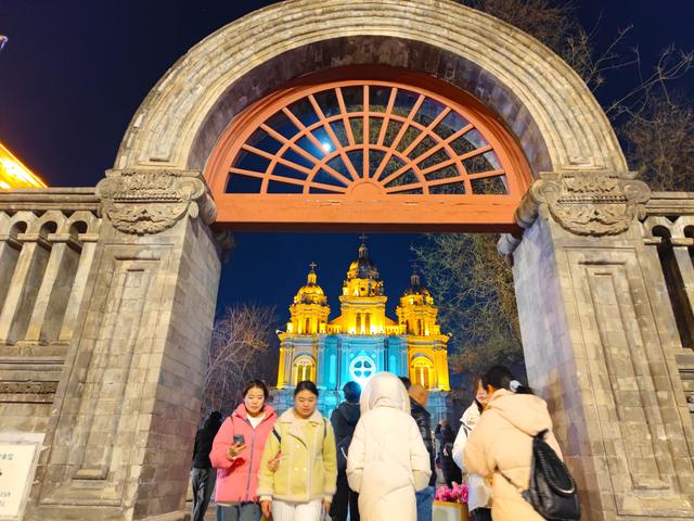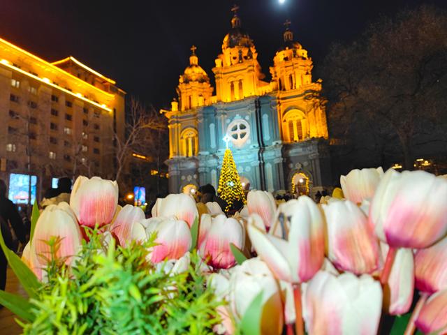 目前教堂前广场上精心布置的圣诞树已经点亮,树上挂满了彩灯、彩球和小雪人,在寒冷的冬夜,犹如一位守护者。树梢上一颗明亮的星星,仿佛天使的指引,而教堂的黄蓝灯光与圣诞树的彩灯交相辉映,显得更为壮观,突出了罗马式建筑的魅力。