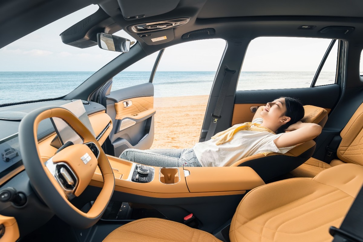 正向研发于 GEA 架构,空间优势尽显。84.3% 长度 “得房率” 居同级之首,3.3m² 透光天窗与 1.18m² 全景天窗组合,隔热隔紫外线佳,赏景采光两不误。车内 34 处储物巧思布局,后备箱隔板创新设计,总容积 528L 可变,后排放倒扩至 2065L,超大空间随心用。座椅灵感源自太师椅,前排 “棉花糖 SPA” 座椅,40 万以下独有的 14 点按摩等功能俱全,后排多维度空间领先,上下车通道宽、门槛低,全员畅享舒适之旅。