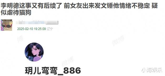李明德和《三人行》剧组以及马天宇的互撕刚结束,女友也跳出来开撕他了,发千字长文控诉其多宗罪,比如虐待狗狗、骂父母,砸别人车、掰车标等,李明德也转发大学同学的博文回应了。